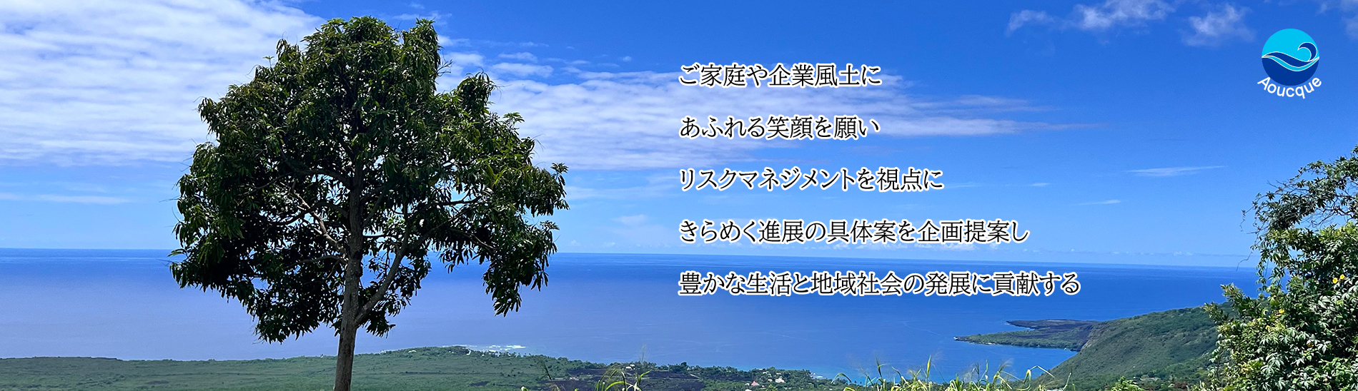 ご家庭や企業風土に、あふれる笑顔を願い、リスクマネジメントを視点に、きらめく進展の具体案を企画提案し、豊かな生活と地域社会の発展に貢献する。